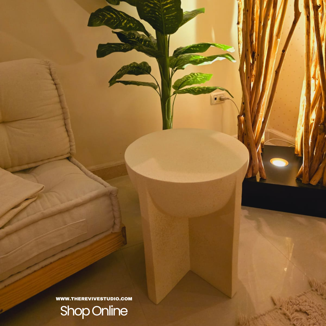 Covered in a concrete finish which makes it perfect for indoor/outdoor use.